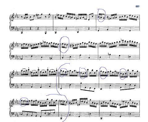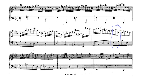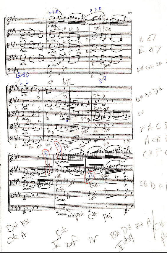 Next, and not unrelated – E# starts appearing in ever longer rhythmic durations, circled in red, below.