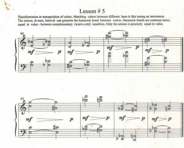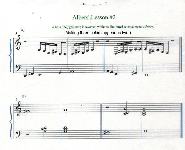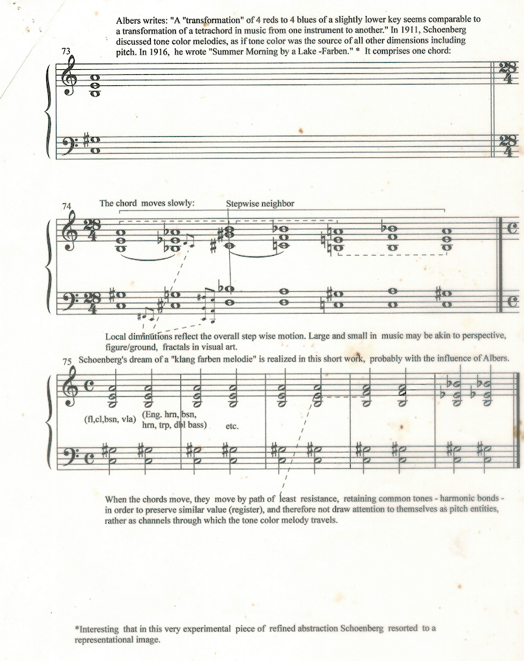 Precise analogies remain to be sought, considered and explored. Meanwhile, Robert Pollock’s musical analogues to Albers’ color studies are offered here. One might look for examples of these analogies in Wolpe’s work Pollock looks at Schoenberg, Wolpe’s teacher’s teacher.